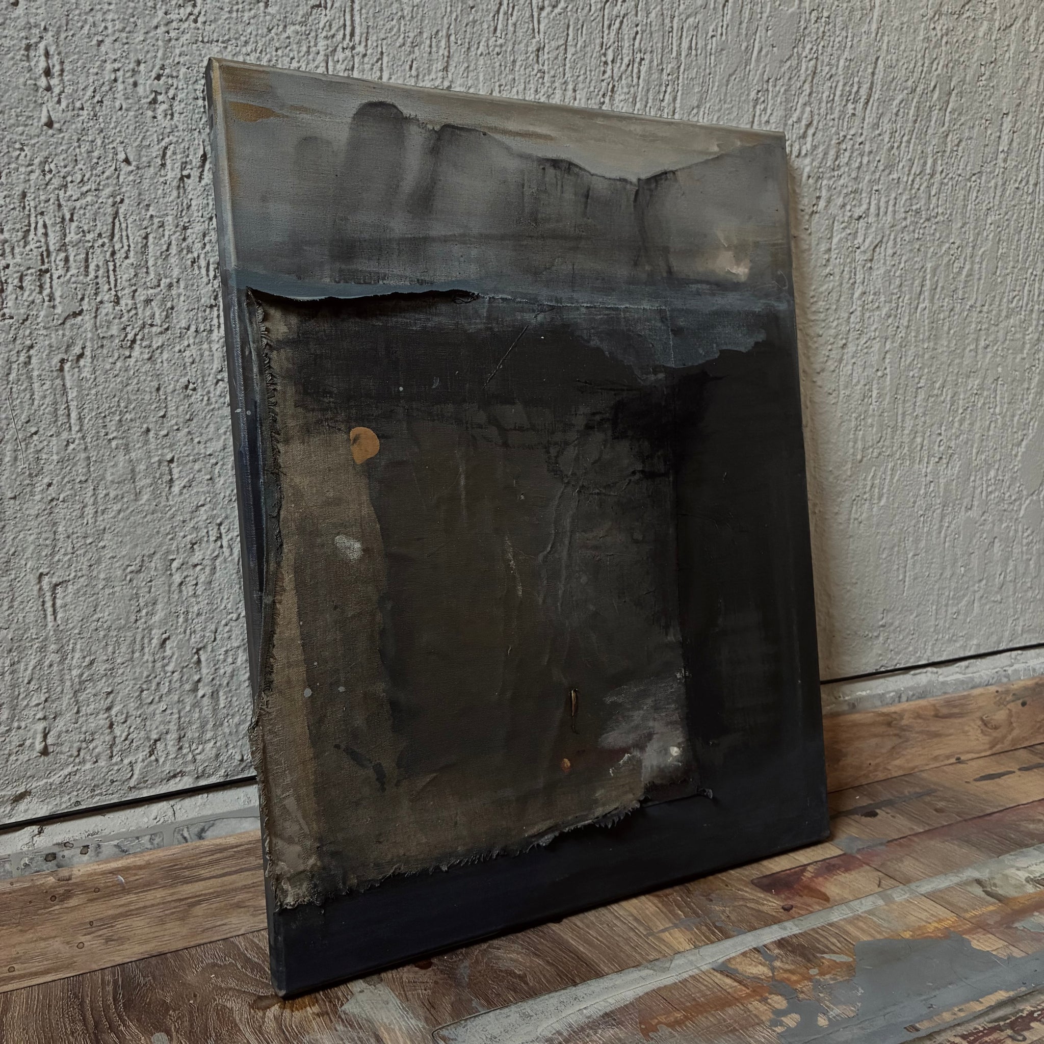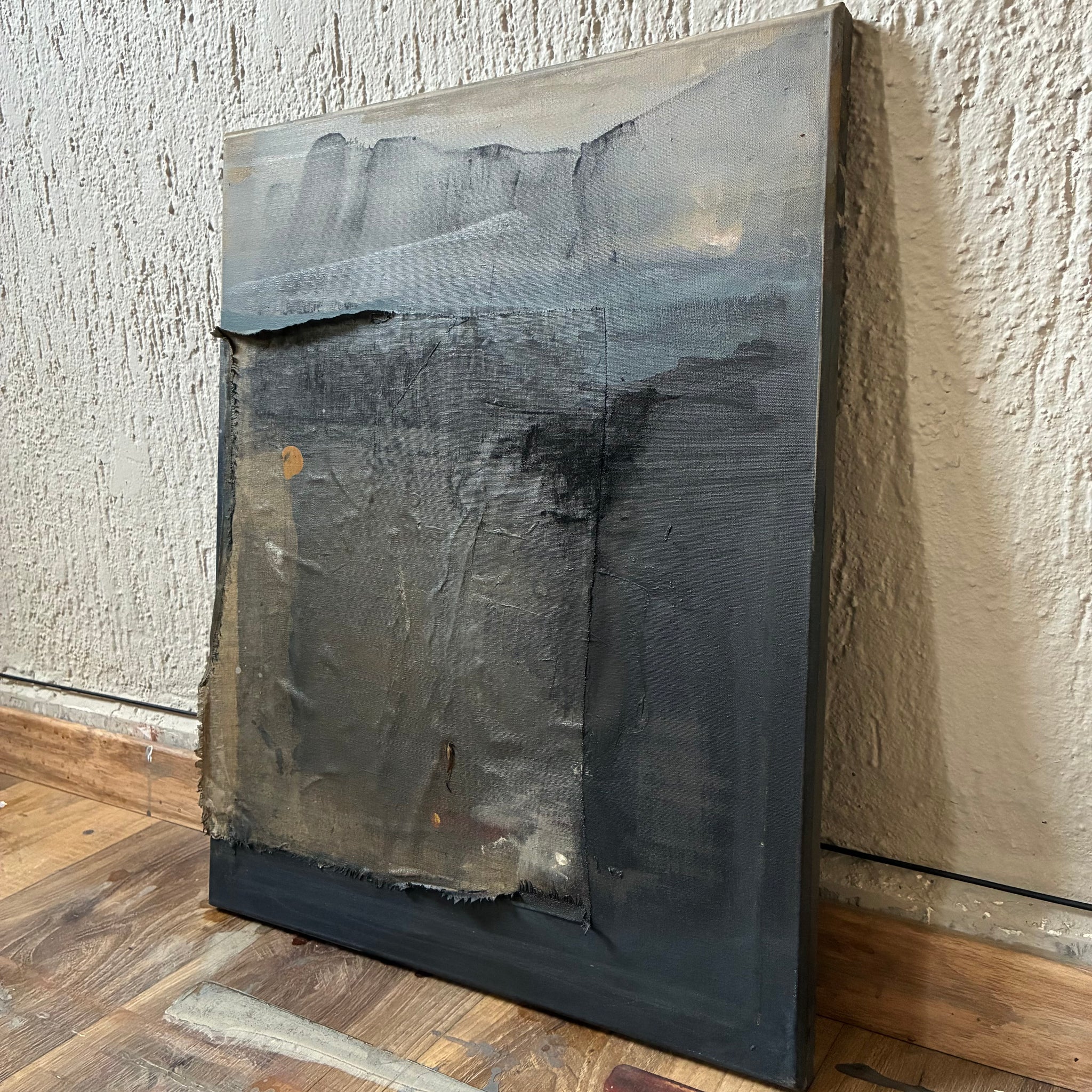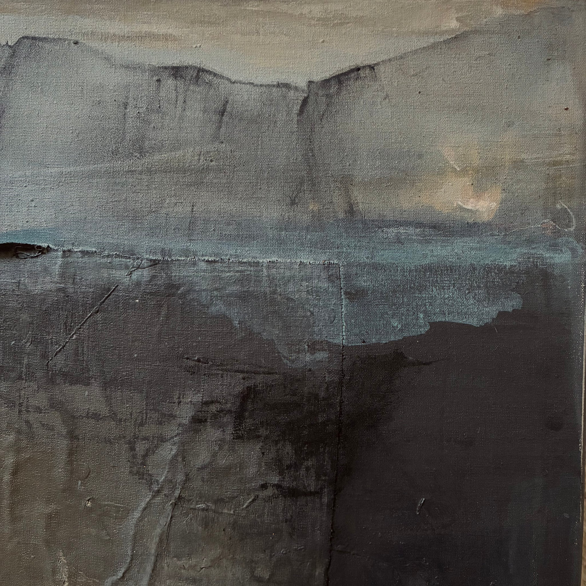 Pieza de colores vainilla, azul medianoche, ocre, carbón, capuccino, grisáceos, arena, aqua y óxidos